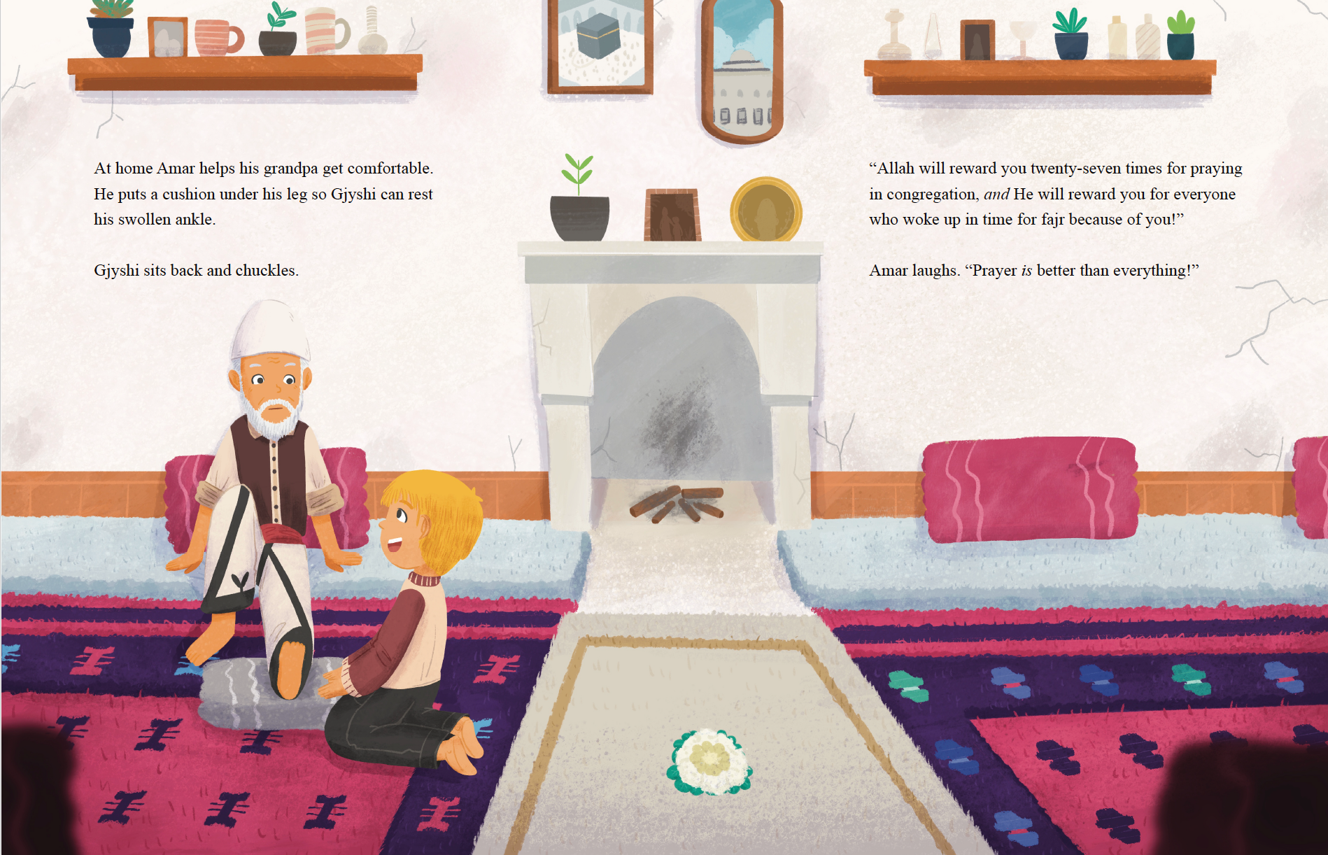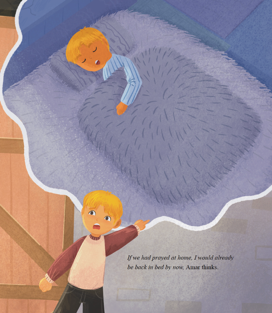 Amar is not very eager to pray fajr at the masjid with his grandfather. It's cold outside, and he's so sleepy! He would much rather pray at home and jump back into his cozy bed.