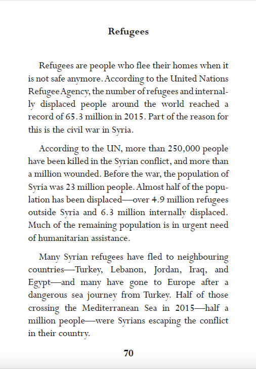 For older children there are books that can devote time to explain issues or offer first hand accounts along with political back stories and historical events. For elementary age children 2nd and 3rd grade particularly, chapter books on refugees are not very common. Children this age seem to relish in silly outlandish characters with a few font happy sentence and pictures on each page or stick to series that are easily predictable as they present tidbits of history or simple mysteries.