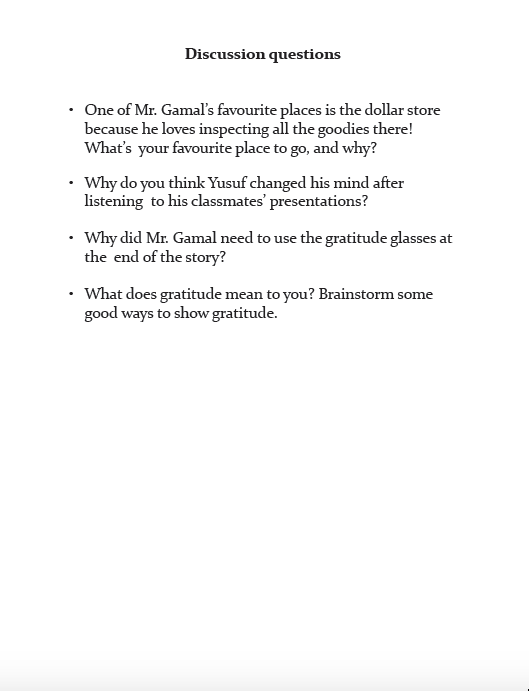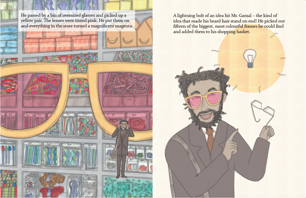 Mr. Gamal’s students are grumpy. He wishes he could help them look at their lives more positively! After a visit to the dollar store, an idea strikes Mr. Gamal like a bolt of lightning: Gratitude Glasses! Will these special spectacles help his students see things they couldn’t see before?